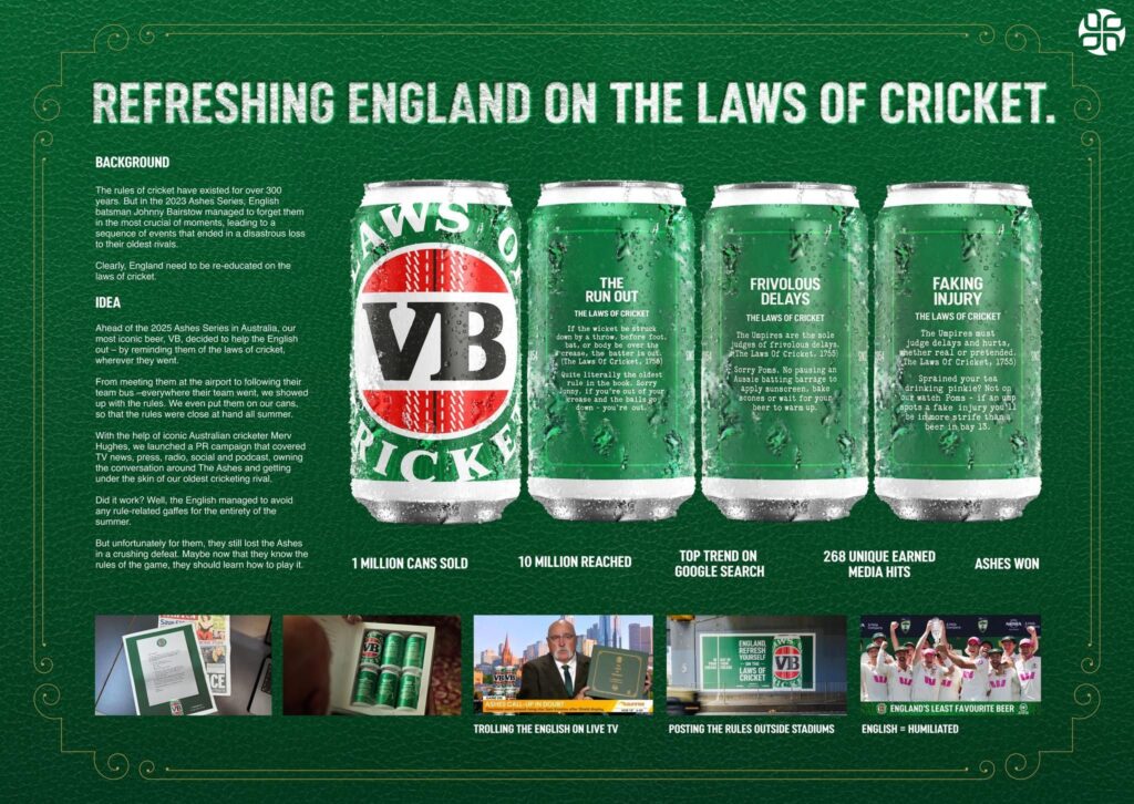 Beyond the headline win, Droga5 ANZ’s versatility was evident in its success across multiple categories. The agency picked up Silver in Industry Craft Copywriting for VB The Laws of Cricket, a campaign that cleverly intertwined Australia’s sporting heritage with brand storytelling. The work was praised for its sharp writing and ability to elevate a familiar cultural touchstone into a fresh narrative that resonated with audiences.