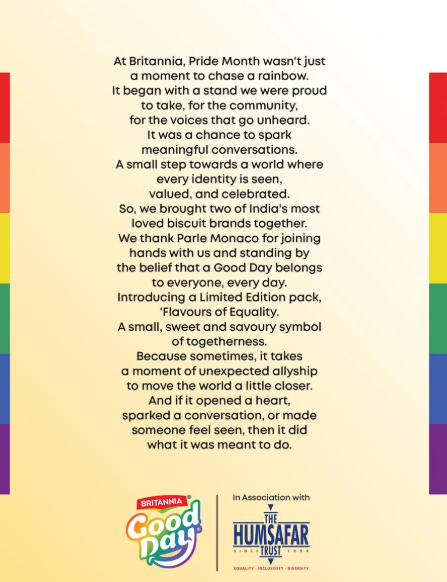 Britannia’s partnership with us was a bold step in showing what allyship can look like in action, and we are thrilled to see that Parle has also joined this journey. This collaboration is not just a celebration of Pride Month; it’s a commitment to standing with the LGBTQIA+ community every day, in ways that are visible, meaningful, and lasting.”