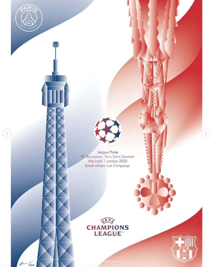 Since 2024, Paris Saint-Germain have added an unexpected layer of artistry to their Champions League campaigns. In collaboration with Penninghen, the international school of interior architecture, communication, and art direction, the club has commissioned students to design posters for each home fixture. The brief is deceptively simple: capture the cultural history of PSG’s opponents and translate it into a visual narrative.